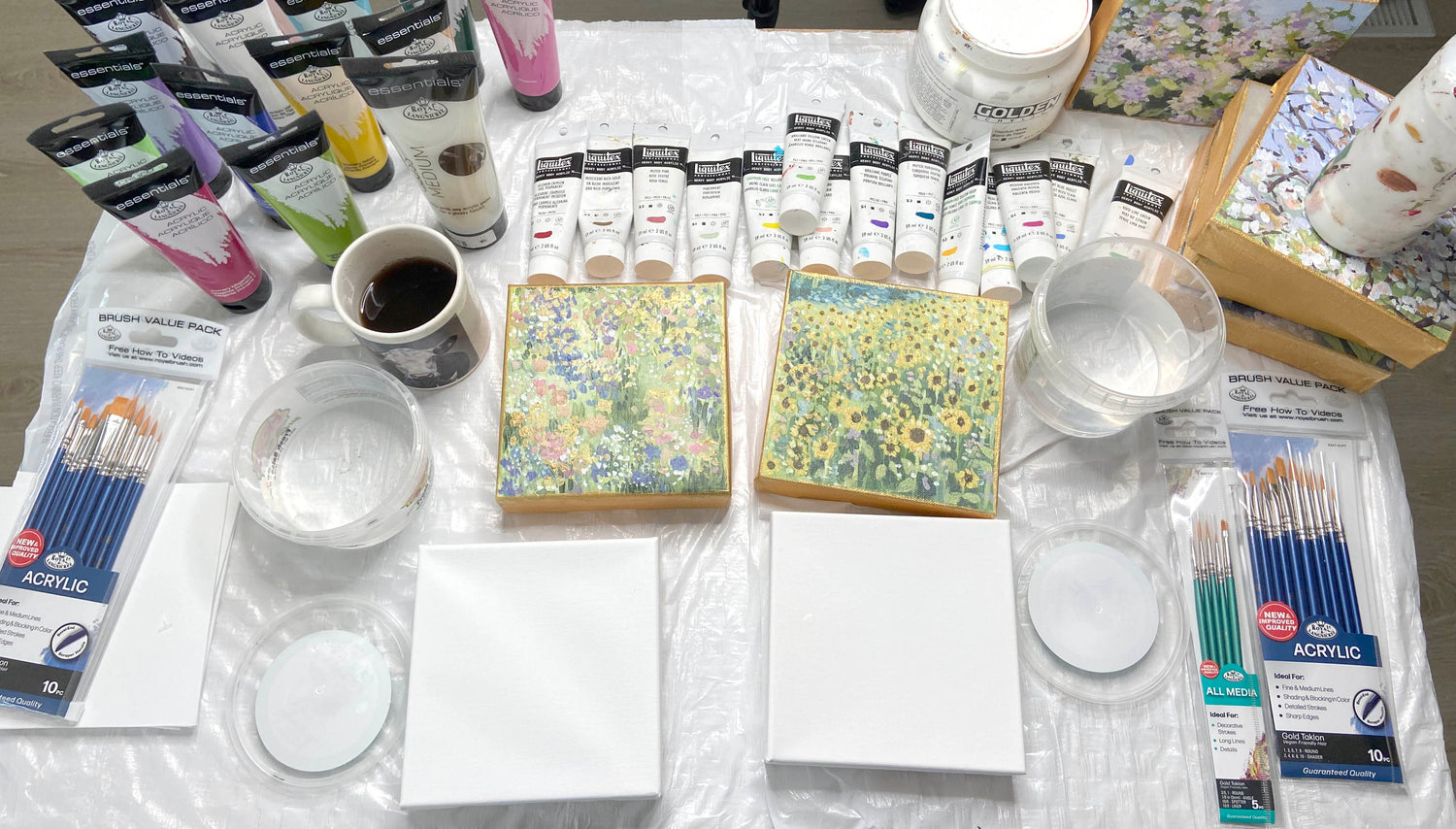 We also paint in acrylic because acrylic paints can be painted and cleaned up with water! Which means you can paint most anywhere!